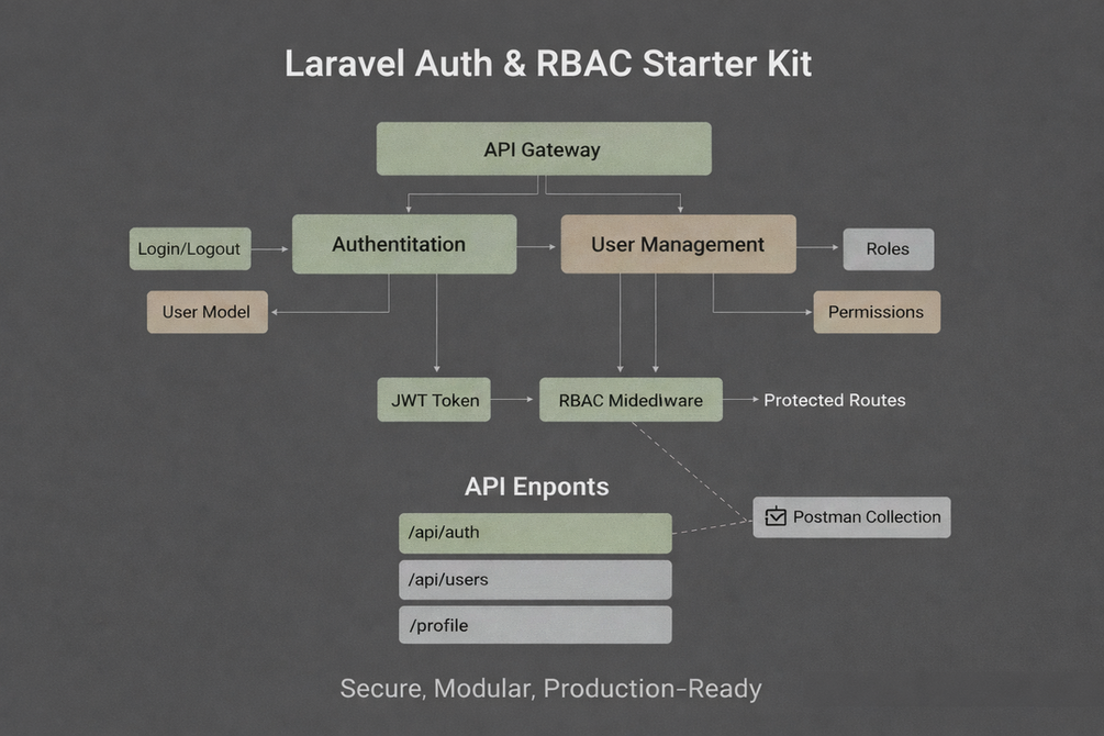 This Laravel 11 Starter Kit provides a secure, production-ready foundation for your next API or web project. It features a clean Modular Architecture to keep your authentication and user management logic organized and scalable. The system is fully equipped with JWT Authentication and a robust Role-Based Access Control (RBAC) for Admin and Staff. You can instantly test every endpoint using the included, pre-configured Postman Collection. Save over 10 hours of development time with this professional, backend-focused boilerplate.